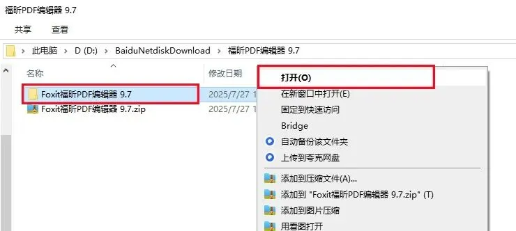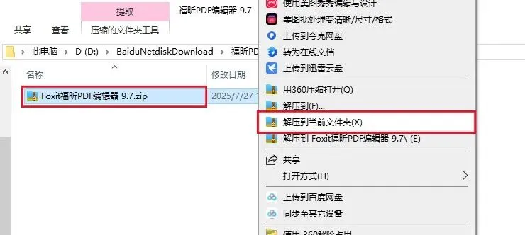 1.打开下载的福昕PDF软件安装包,鼠标右击压缩包选择【解压到当前文件夹】。