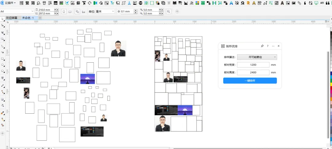 功能简介:该插件可实现的效果是在一个大矩形区域内紧凑排列很多小矩形,即常说的矩形优排效果,可用来制作紧凑布局的排版效果,也可用来进行排料。