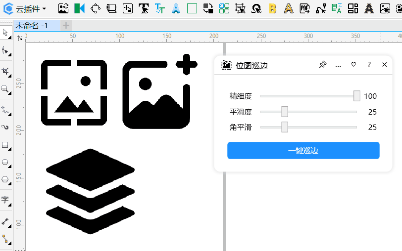 功能简介:该插件可根据位图的轮廓生成矢量的图形(即常说的巡边效果),可用来制作异形的广告牌,也是UV加工常用功能之一。支持常规巡边、外部轮廓巡边等功能,可调节平滑度,自动优化减少节点。
