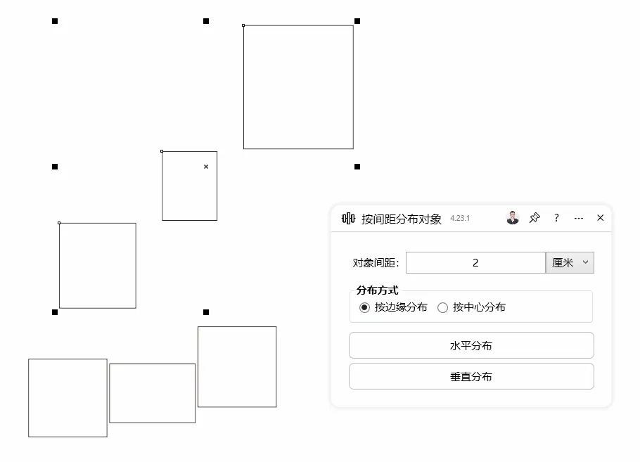 功能简介:该插件可实现高级增强分布,将选定对象批量按照指定的距离,按边缘或者按中心,水平或垂直分布对象,还可以按对象的尺寸排序(例如鞋样有尺码大小),支持毫米、厘米和英寸三种单位。