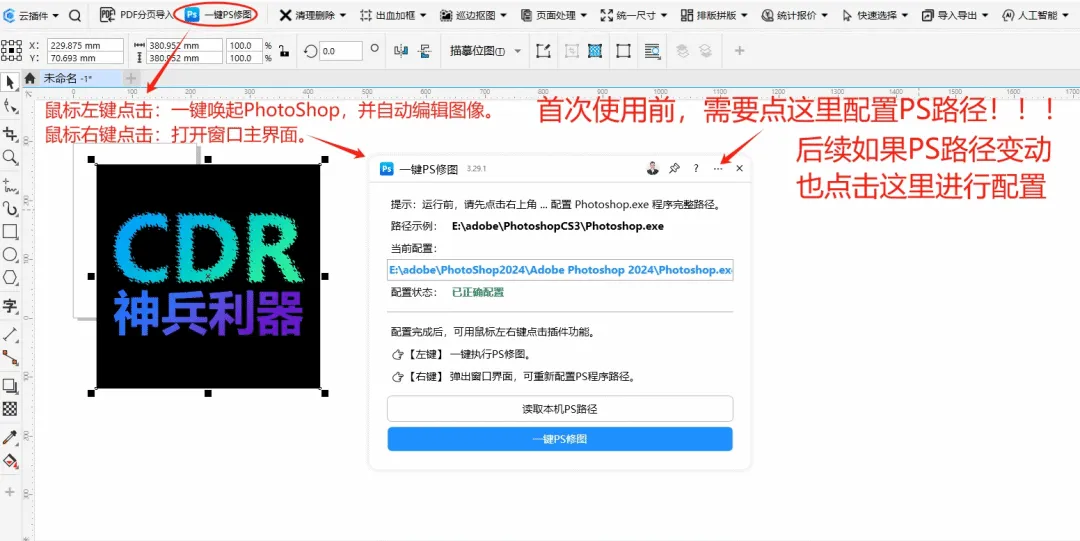 功能简介:该插件可实现将选定的图像一键调用PhotoShop进行编辑,并可以在CDR中自动更新。