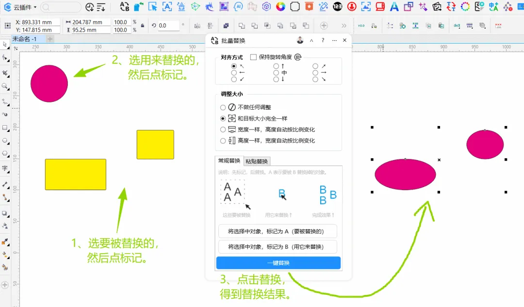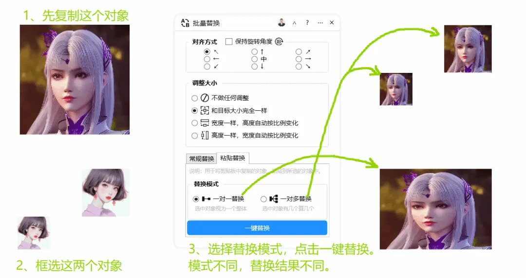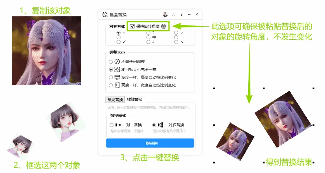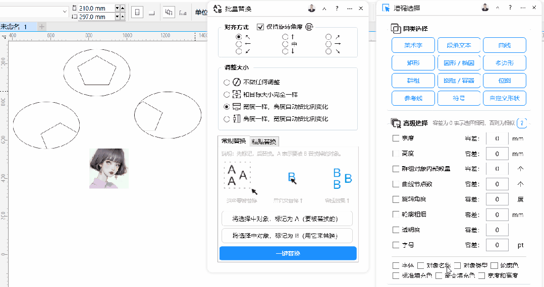 功能简介:快速替换对象,支持常规替换和粘贴替换,支持灵活的尺寸调整和对齐方式、保持旋转角度等功能,排版必备通用功能之一。