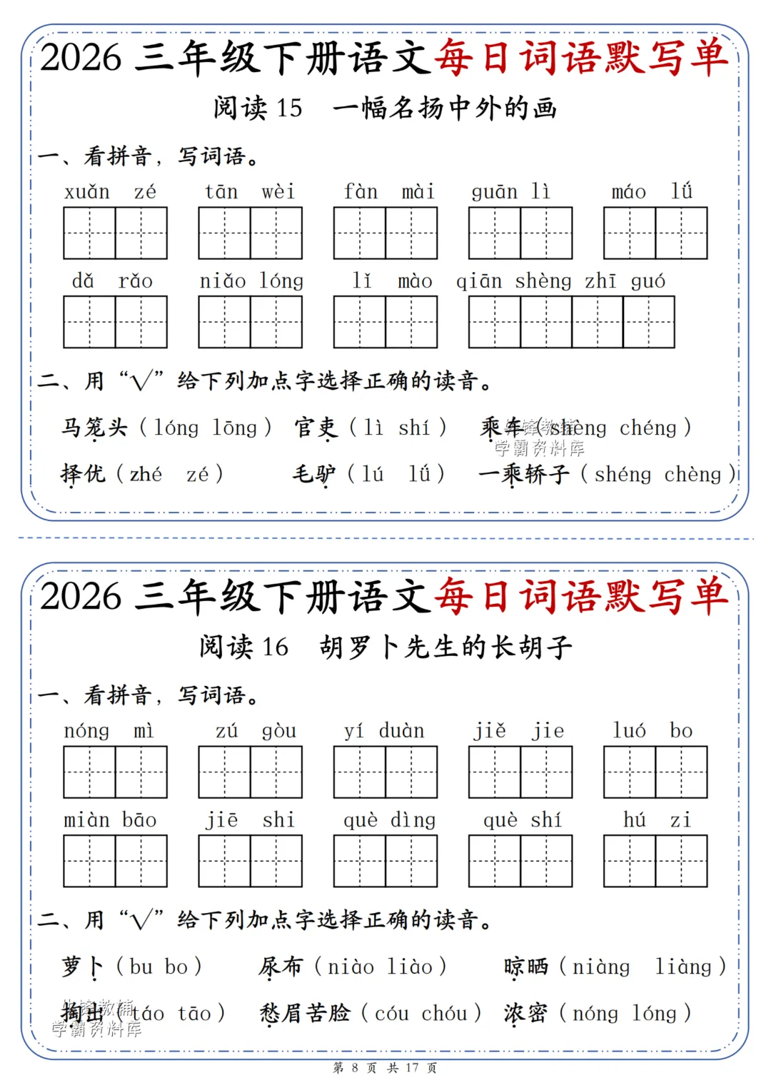 嗨!我是小敏,今日分享26年春最新版《三年级下册语文每日词语默写单小纸条一课一练(1-4单元)》电子版可下载打印。