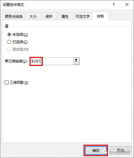 8. 在弹出的对话框中选择 G1 来放置单元格链接 –> 单击“确定”