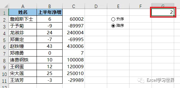 现在 G 列虽然仍然是数值,但是通过格式设置,会随着控件的选择分别显示为“升序”和“降序”。