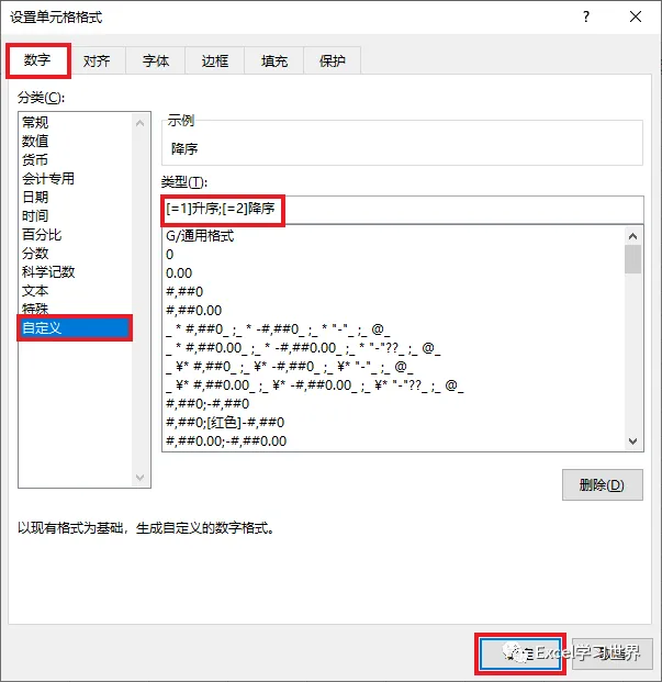 10. 选中 G1 单元格 –> 按 Ctrl+1 –> 在弹出的对话框中选择“数字”选项卡 –> 选择“自定义”–> 输入以下类型 –> 点击“确定”: