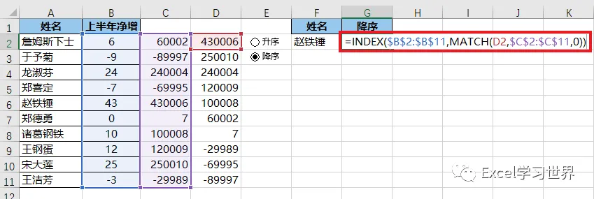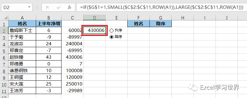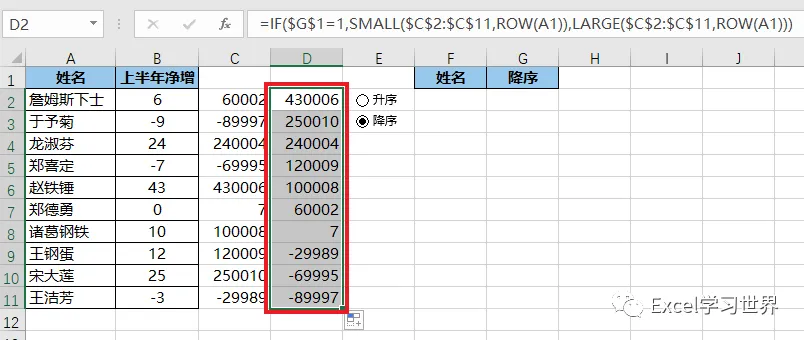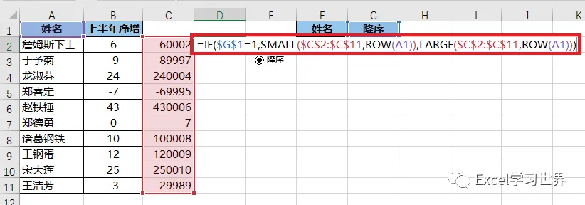 IF($G$1=1,…,…):如果 G1 的值为 1,则升序排序;否则就降序排序