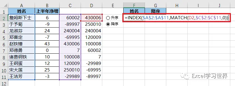 index+match 的公式组合已经写过太多案例了,作用是先用 match 函数在 $C$2:$C$11 中找到 D2 的排列位置数;