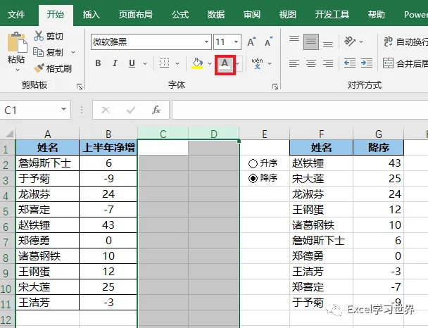 15. 将辅助列的字体设置为白色,隐藏起来。
