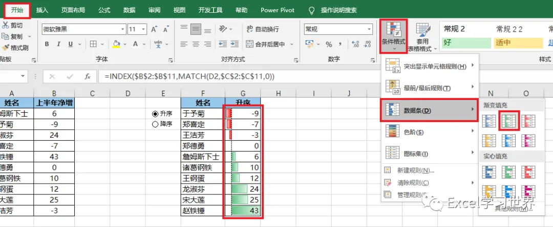16. 选中 G2:G11 区域 –> 选择菜单栏的“开始”–>“条件格式”–>“数据条”–> 选择所需的数据条颜色