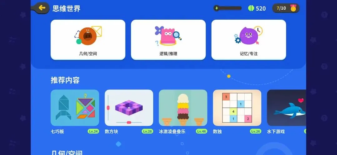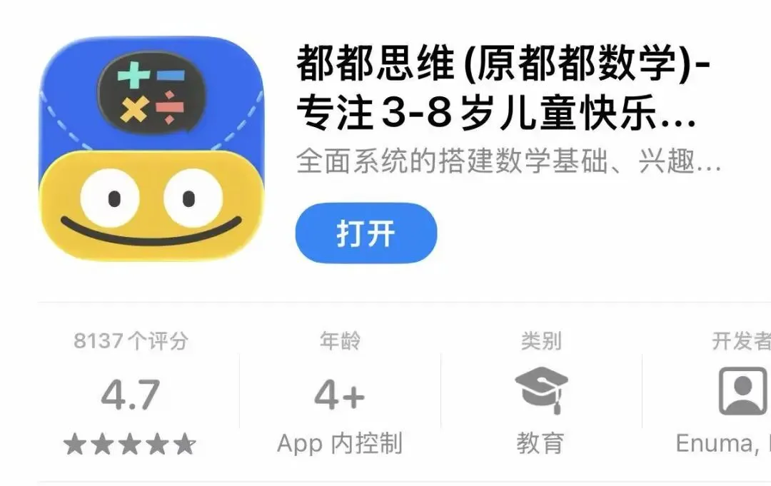 这个是针对3-8岁的思维启蒙、数学基础概念搭建、数感培养的APP,主旨是在快乐的游戏闯关中探索数学知识,把抽象的数学知识,变成了娃爱玩儿的闯关游戏。