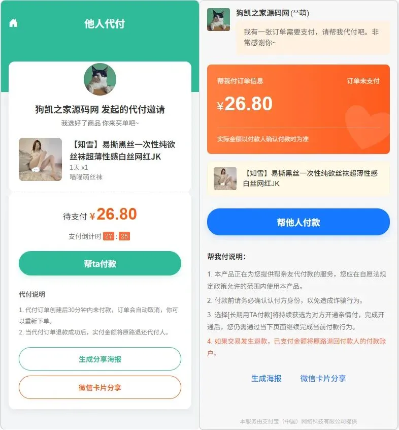 • 想买个游戏皮肤、点卡,或者和同学拼单买资料,自己暂时不方便付,生成代付链接让好友 / 同学帮忙,之后再转账还回去,都是正常的人情往来。
