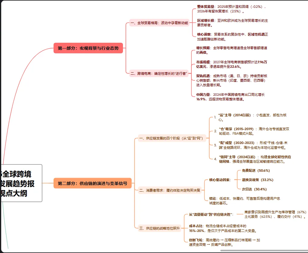 把行业报告上传给大模型(DS、豆包等都行),提示词:“把文件中的内容提取出主要观点的概括,形成大纲,方便我快速阅读,用markdown格式输出。”这里重点是markdown格式,因为md文件能导入到思维导图中。