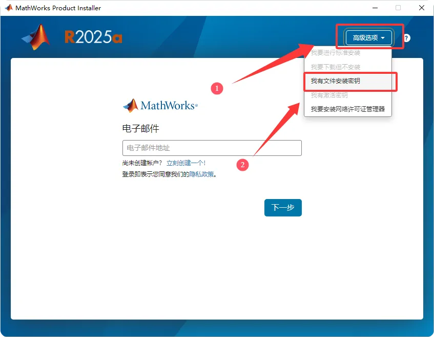 3.点击高级选项,下拉点击”我有文件安装秘钥”。