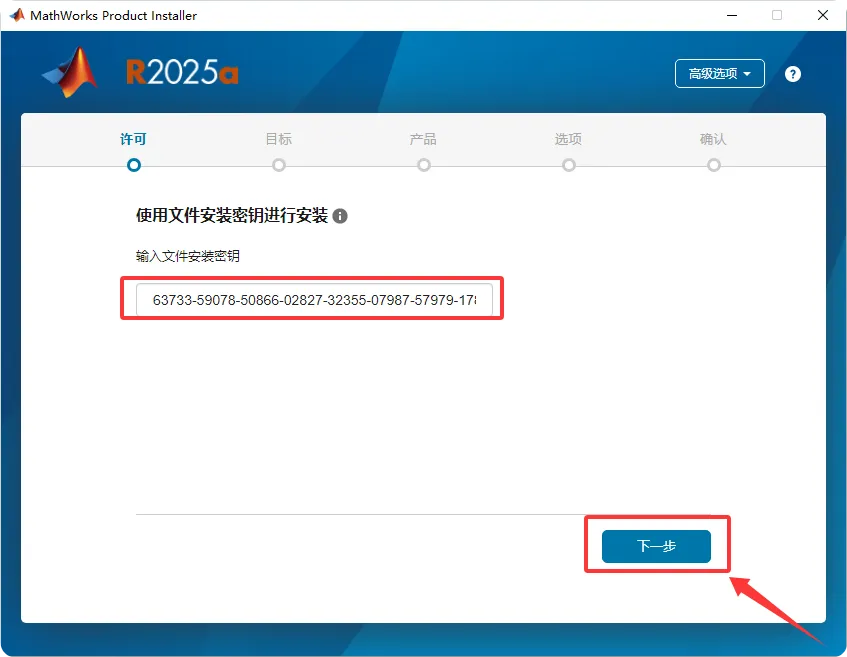 5.输入密钥63733-59078-50866-02827-32355-07987-57979-17850-05492-24096-05227-42839-55624-20610-22640-51189然后点击下一步