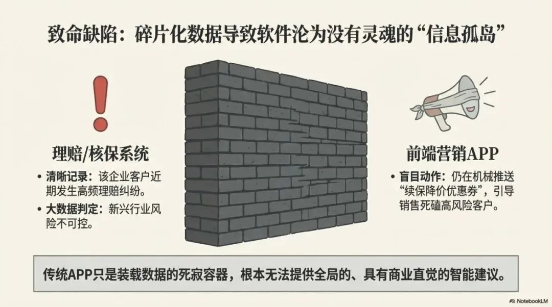 比如:理赔系统里清清楚楚地记录了某个企业客户最近发生了高频的理赔纠纷,但前端的营销APP完全不知道,甚至还在机械地给这个高风险客户自动推送续保降价的优惠券;