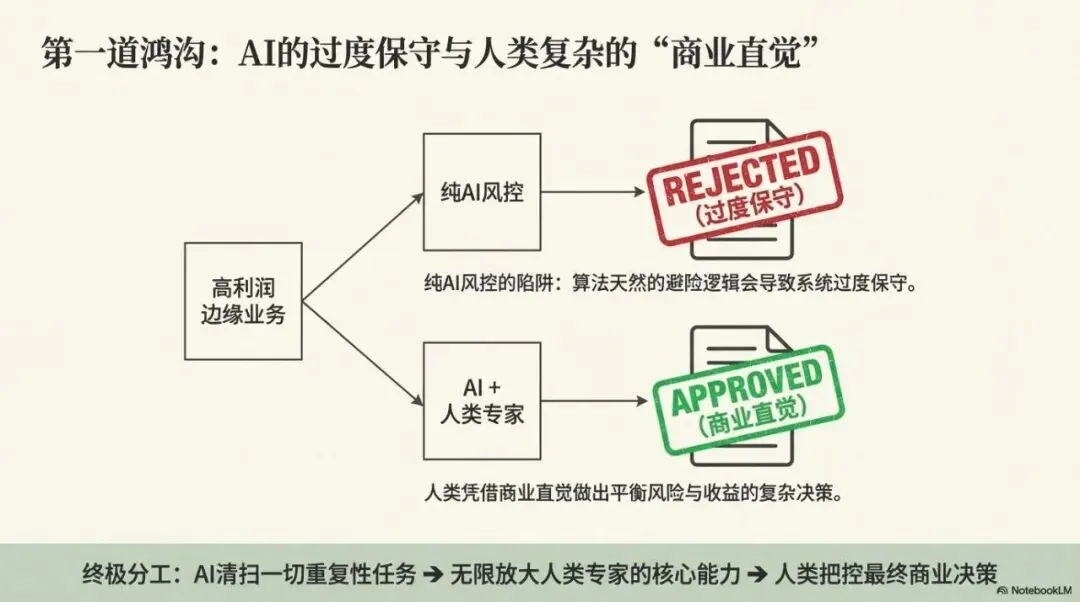 答案也是否定的。因为我们发现,如果缺乏人类商业直觉的干预,纯粹由AI驱动的风控系统,往往会因为过度依赖历史数据而变得“过度保守”。