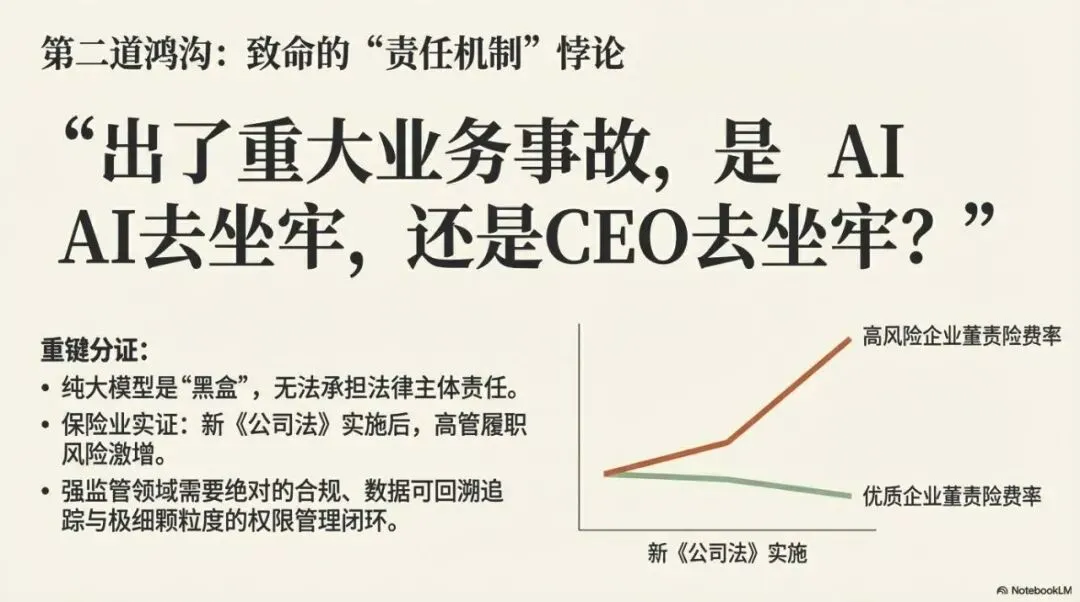 纯粹的AI模型是无法承担法律主体责任的。在这样一种高管履职风险激增、监管极度严苛的环境下,企业敢把生杀大权完全交给一个“黑盒”AI吗?