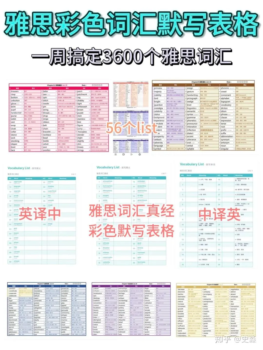彩色表格按颜色分类记忆,共56页,10个List(可以利用一些碎片化时间来进行记忆背诵单词)