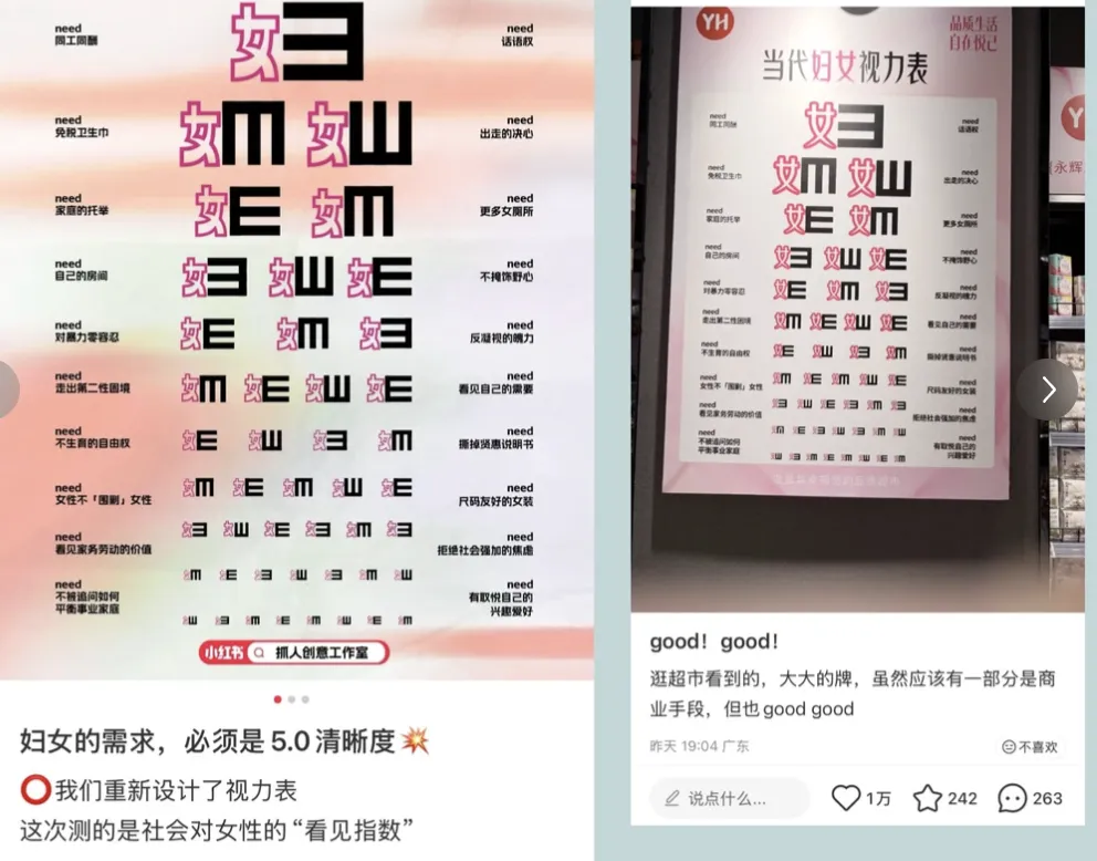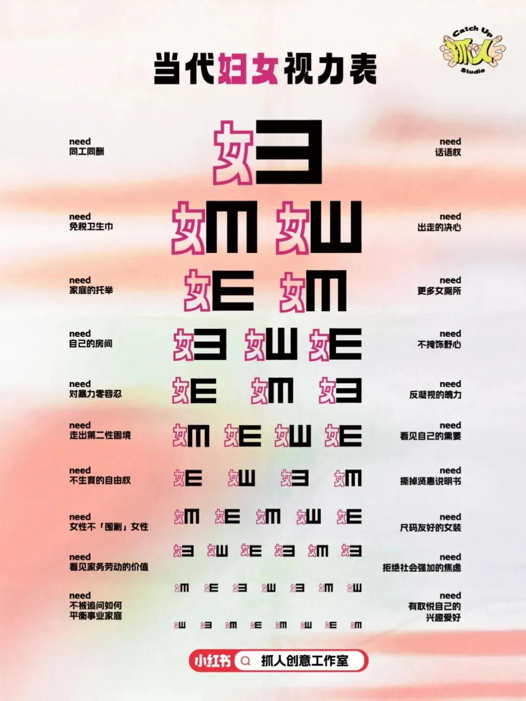 去年三八妇女节,抓人编辑部在小红书端以@抓人创意Studio 账号发布了一个原创作品《当代妇女视力表》,灵感来源于一次选题会后我们对“女性真正需求”的创意式解读: