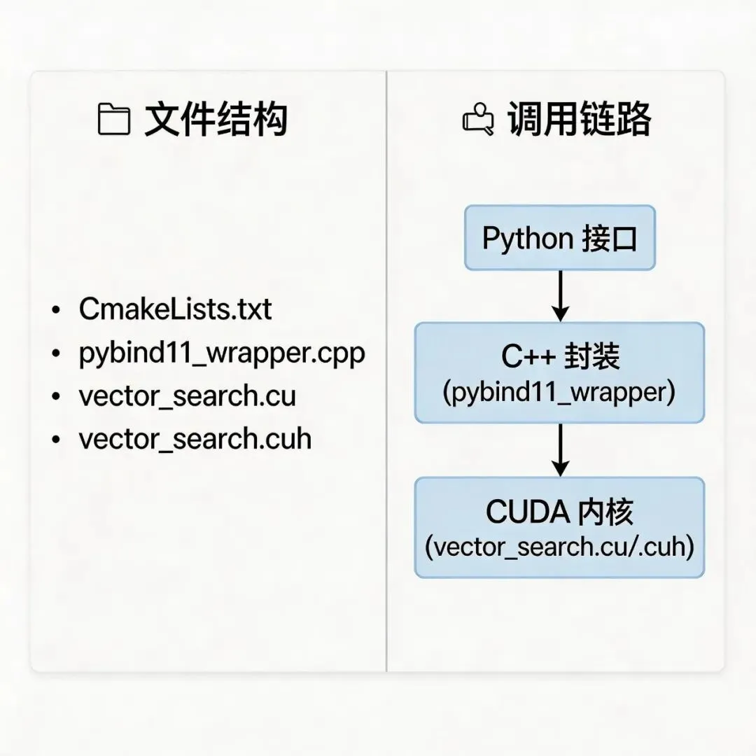 而今天要拆解的这份源码,正是一套工业级GPU加速向量搜索库:基于CUDA编写内核,通过pybind11封装Python接口,支持批量向量搜索、L2归一化、欧氏距离/点积计算,代码简洁可复用,性能比CPU版本提升100+倍,新手也能直接上手部署。