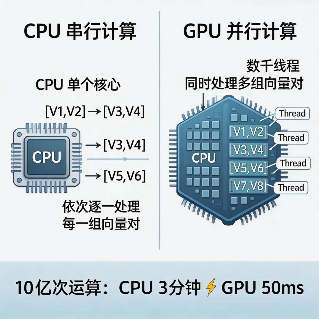 GPU的核心优势是「多线程并行」,与CPU的“少量核心+高主频”不同,GPU拥有数千个轻量级计算核心,适合同时执行大量相同的简单任务(比如每个线程计算一个向量对的相似度)。