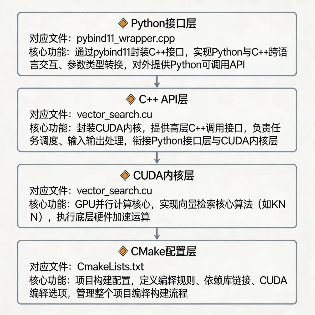 这套源码采用「三层架构」设计,分层清晰、解耦性强,便于维护和扩展,从底层到上层依次是:CUDA内核层→C++ API层→Python接口层,再加上CMake配置层,构成完整的可编译、可调用的向量搜索库。