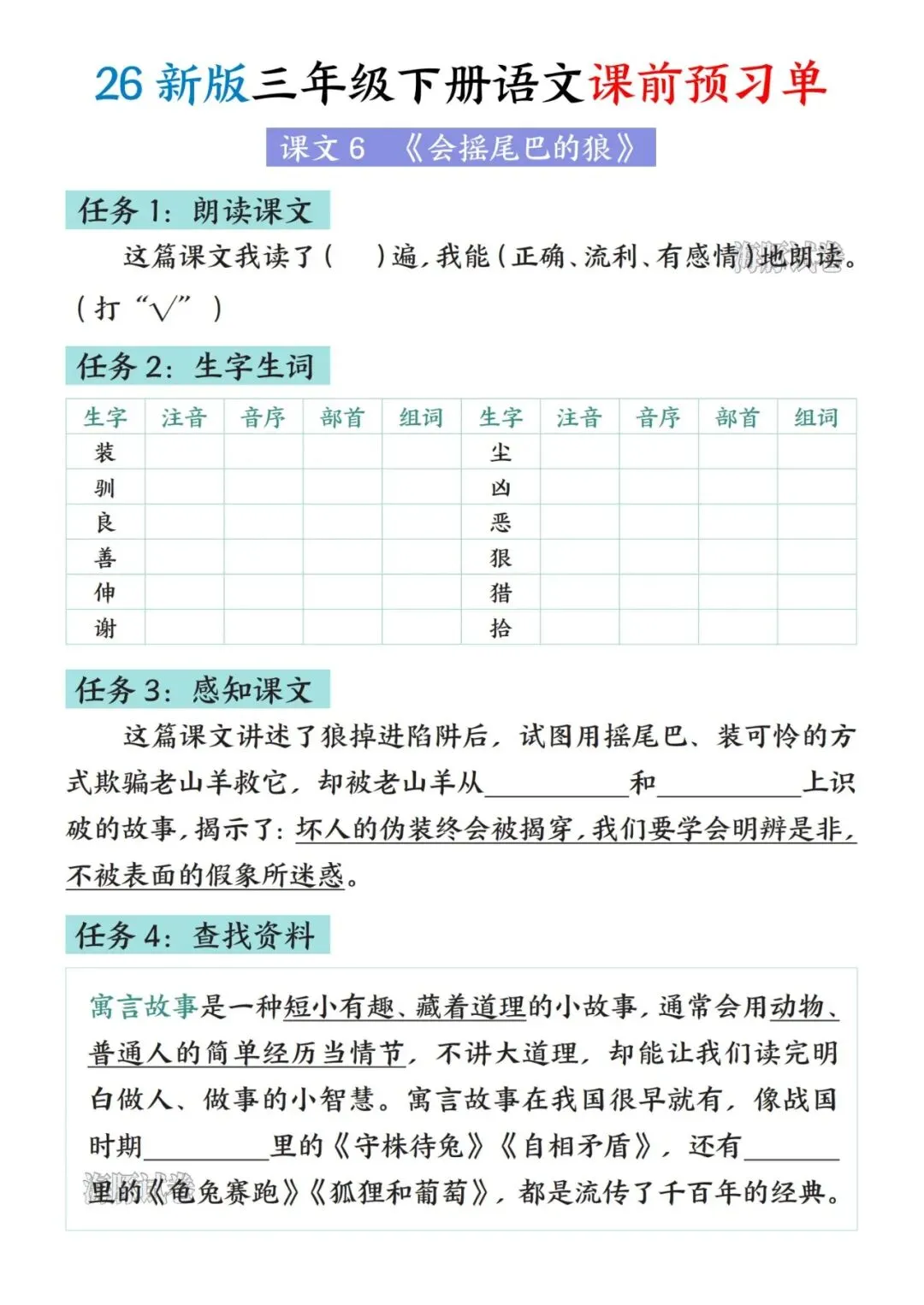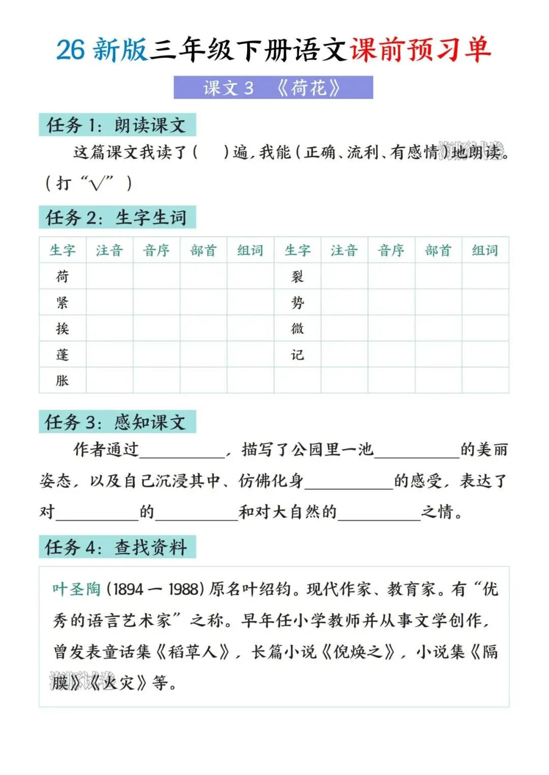 26新版三年级(下)语文课前预习单,共27页,每课预习分为4个任务,1,朗读课文。2,生字生词。3,感知课文。4,查到资料。需要的老师家长们快给孩子打印出来吧。
