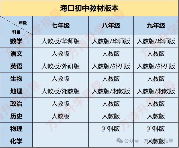 海口初中在数学、英语和地理这三科上,部分省属学校和其他学校使用的教材版本不太一样。