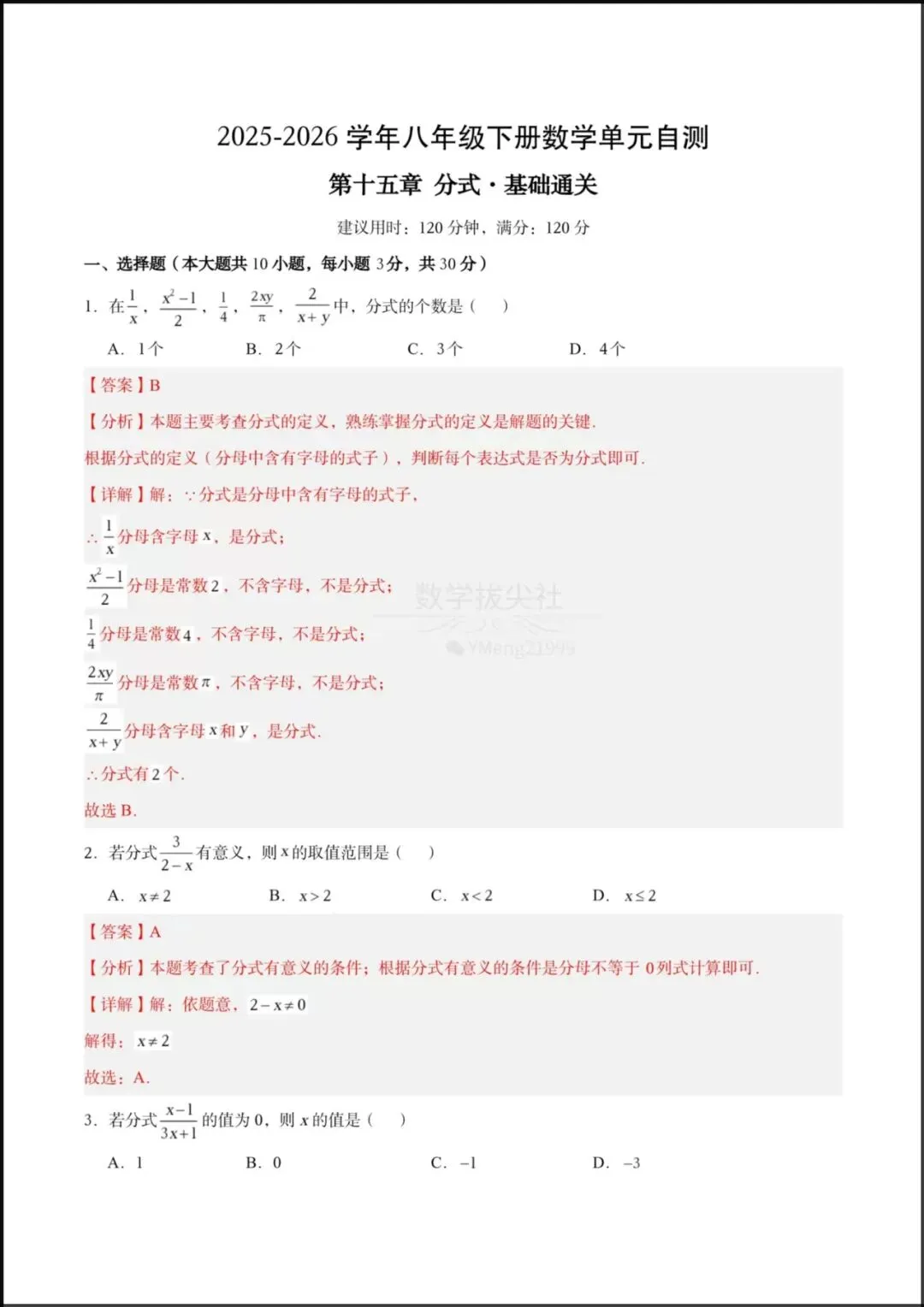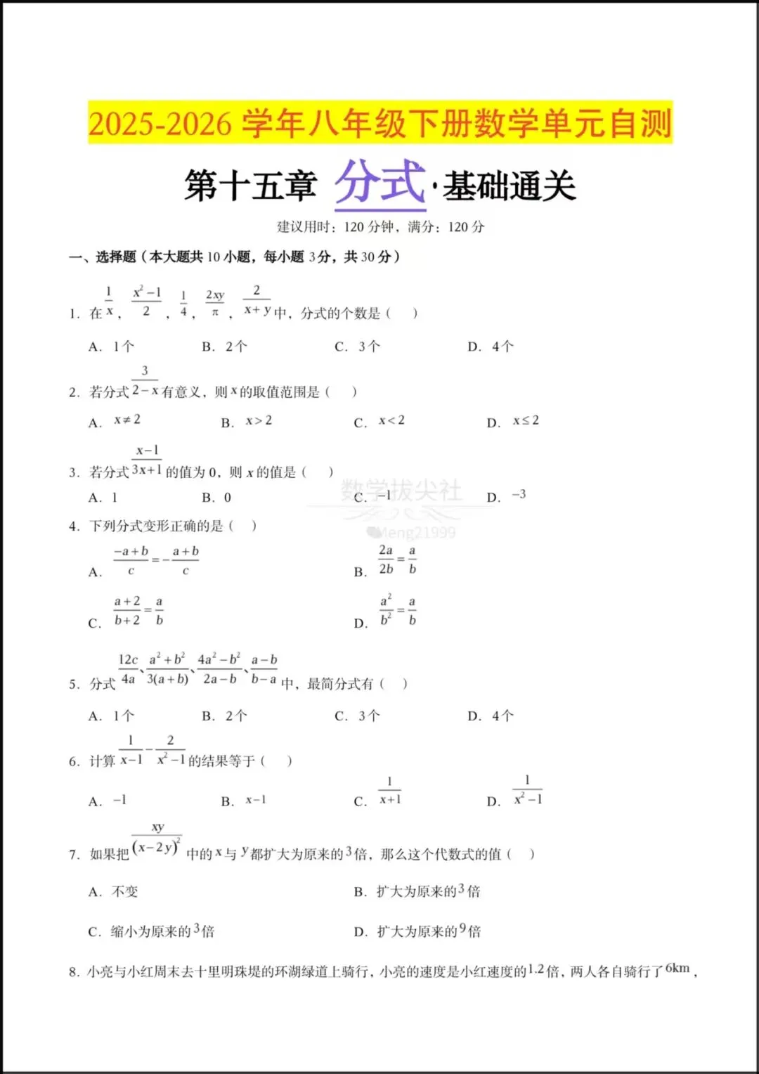 2026春新版教材【华师版】 八年级下册〈数学〉第十五章《分式》单元自测基础卷,有解析,可下载打印!