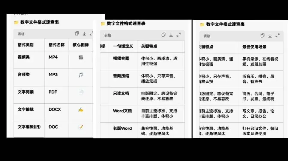 这几种格式是数字生活中最常见的文件类型,它们分别承担了影像、声音、文档阅读和文字编辑四大核心功能。