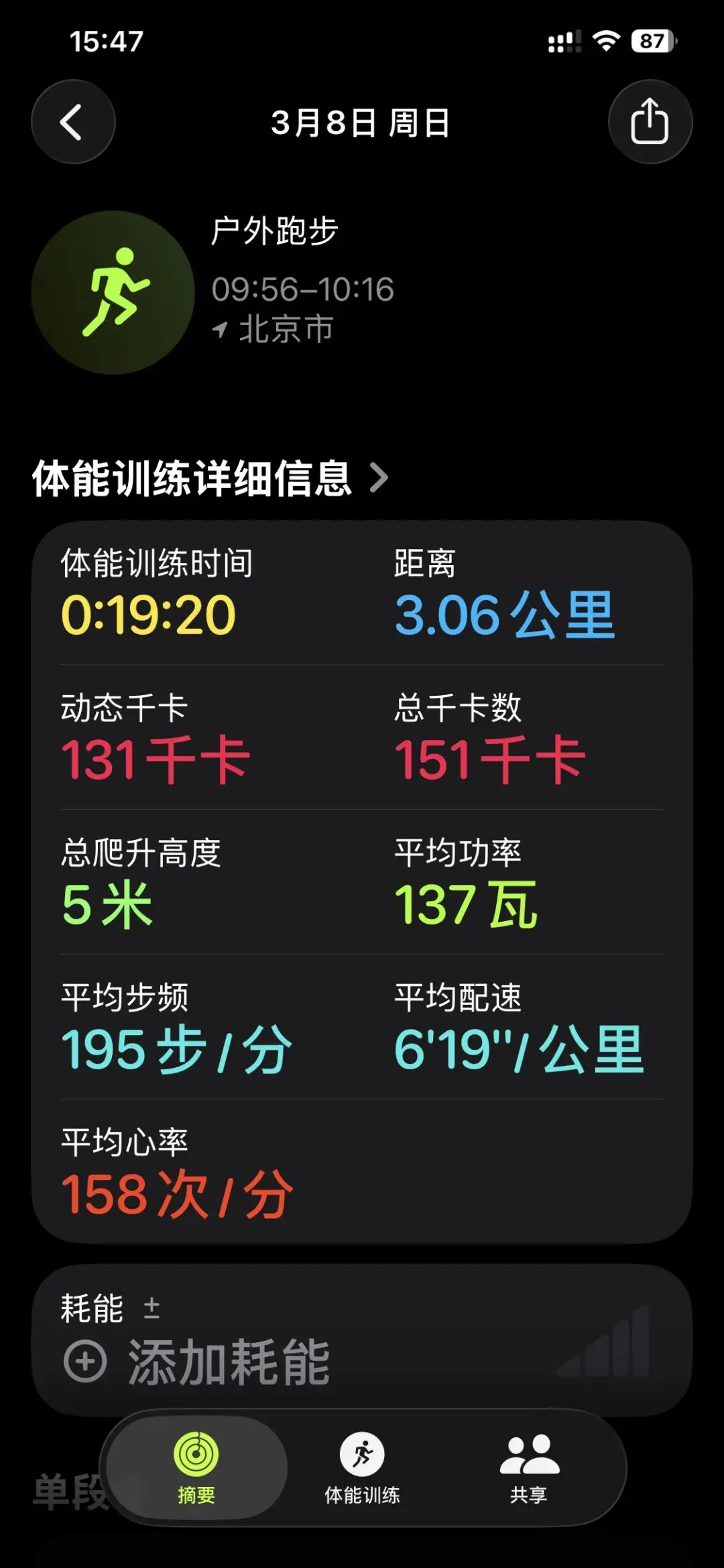 那些数字可以消失,但今天早上的风我记得。跑到第8公里的时候,中关村公园里有人在唱歌,歌声萦绕在耳畔让我跑得更加轻松。跑到第10公里的时候,小腿前侧开始不适,极度酸胀,这是之前没有出现过的症状,我鼓励自己:慢慢跑,不追求速度,一定能跑回家的。跑到第14公里的时候,我心里燃起莫名的兴奋,想着再坚持一下下就快结束了,却在路上碰到了不拴绳子的狗,那只狗每走两步就要回头看我,我果断折返换个路线。