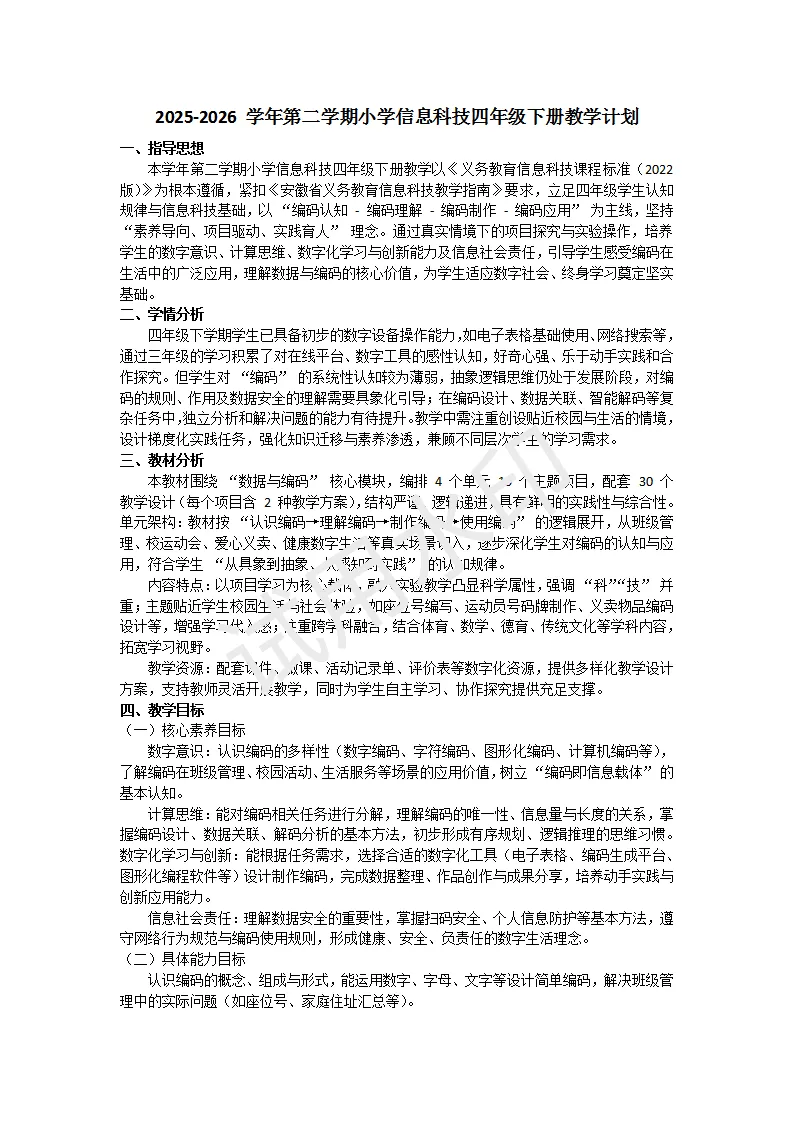 【教学计划】电子工业版四年级信息科技2025-2026第二学年度教学计划