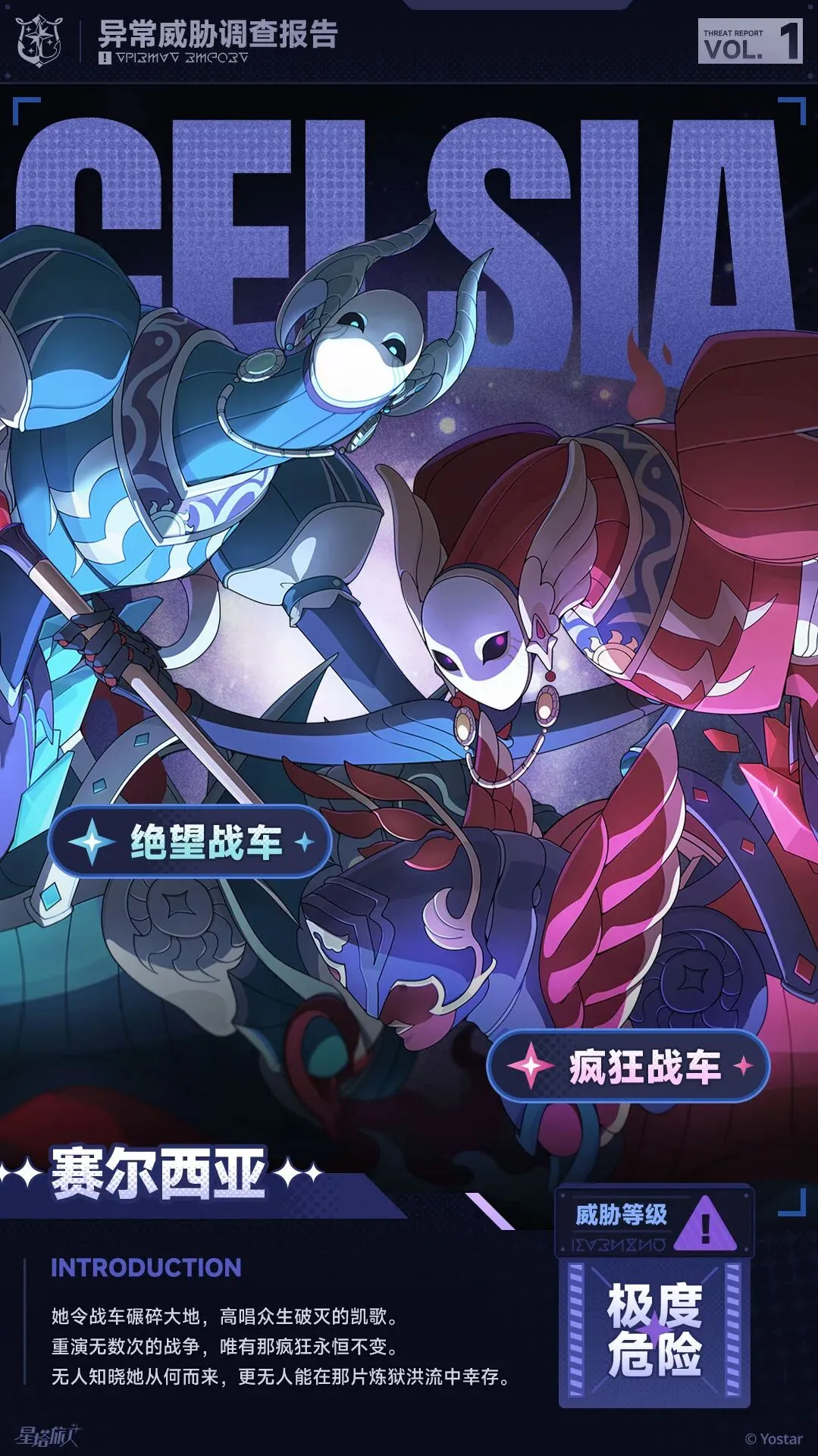 赛尔西亚是降临于星塔中的强大存在。她对战争有着超乎常理的狂热,为此她将自己化身为互相对峙的棋手,在她创造的领域中上演永不停歇的斗争。