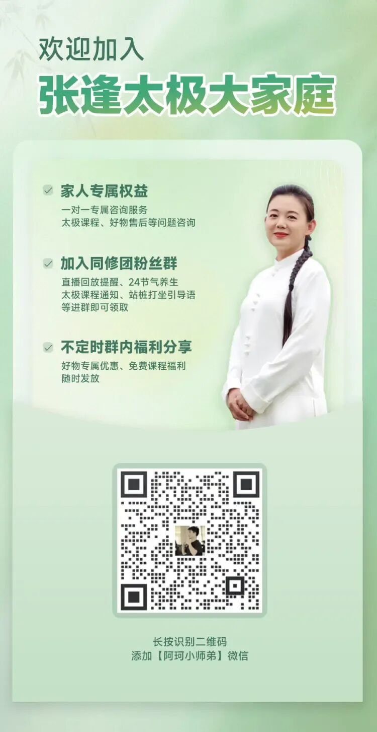 如果您对太极有兴趣,或者一直有跟着老师的直播或课程学习,再或者您本身就是混元太极的同门,都欢迎加入到“张逢老师大家庭”,也就是我们的“同修团微信群”,和万千同修们一起交流、相互学习。