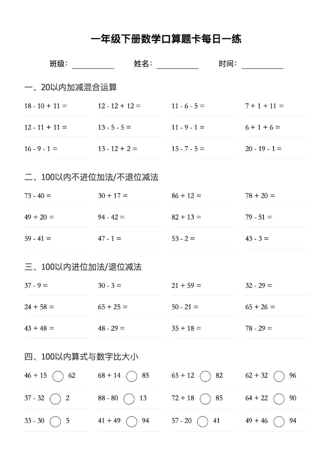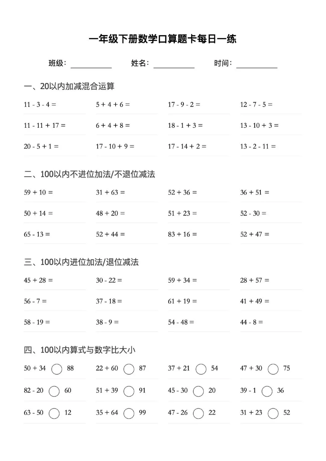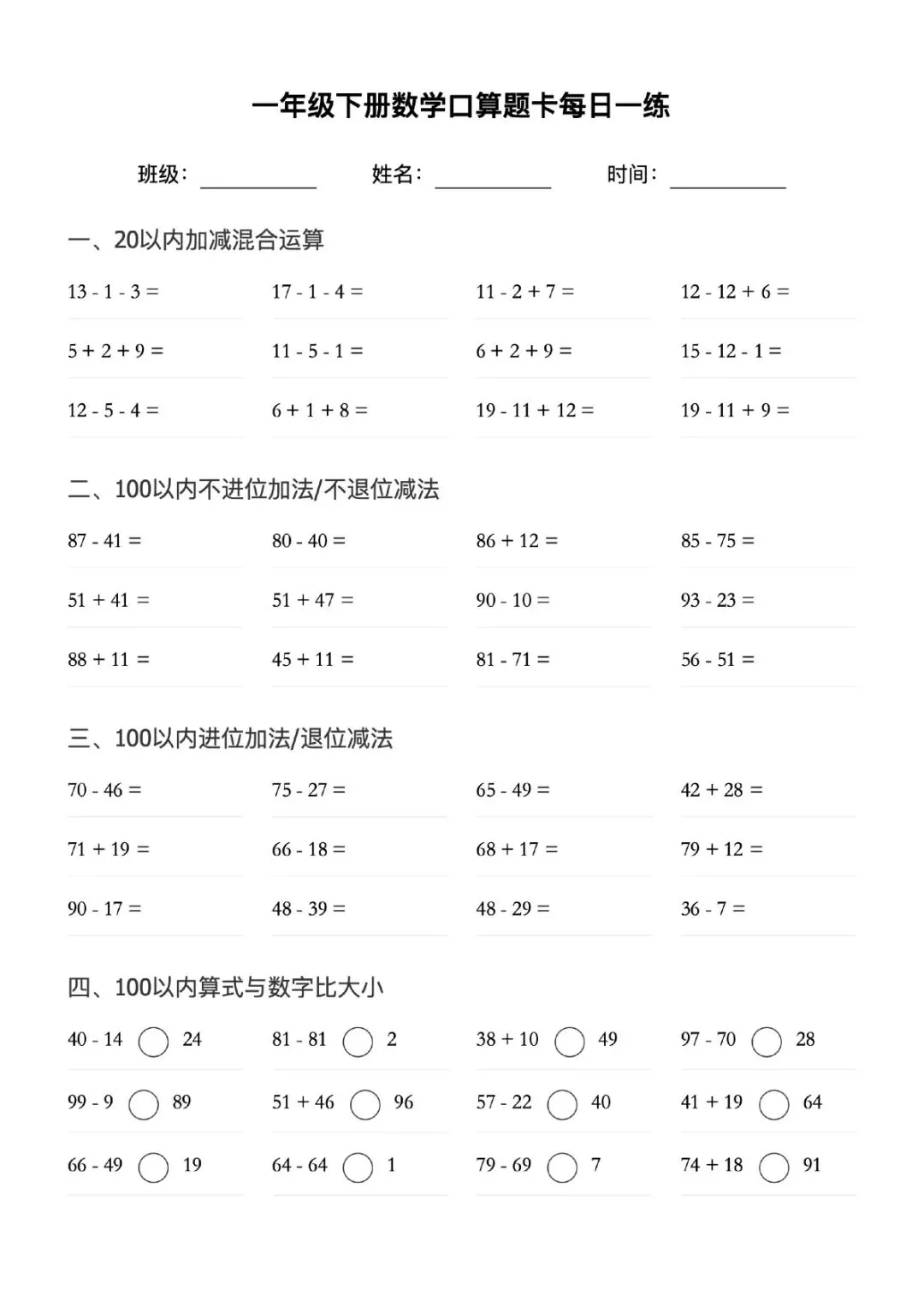 一年级下册数学口算题卡每日一练可打印电子版带答案