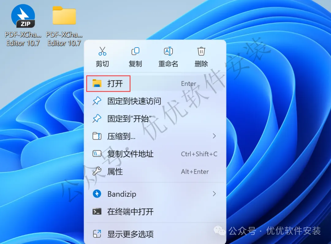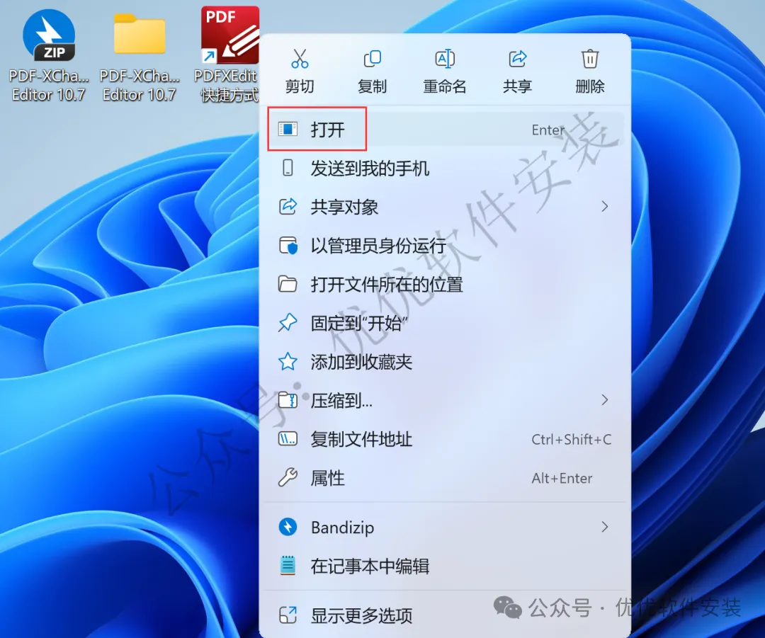 4、回到桌面,右键桌面上的【PDFXEdit软件图标】,点击【打开】