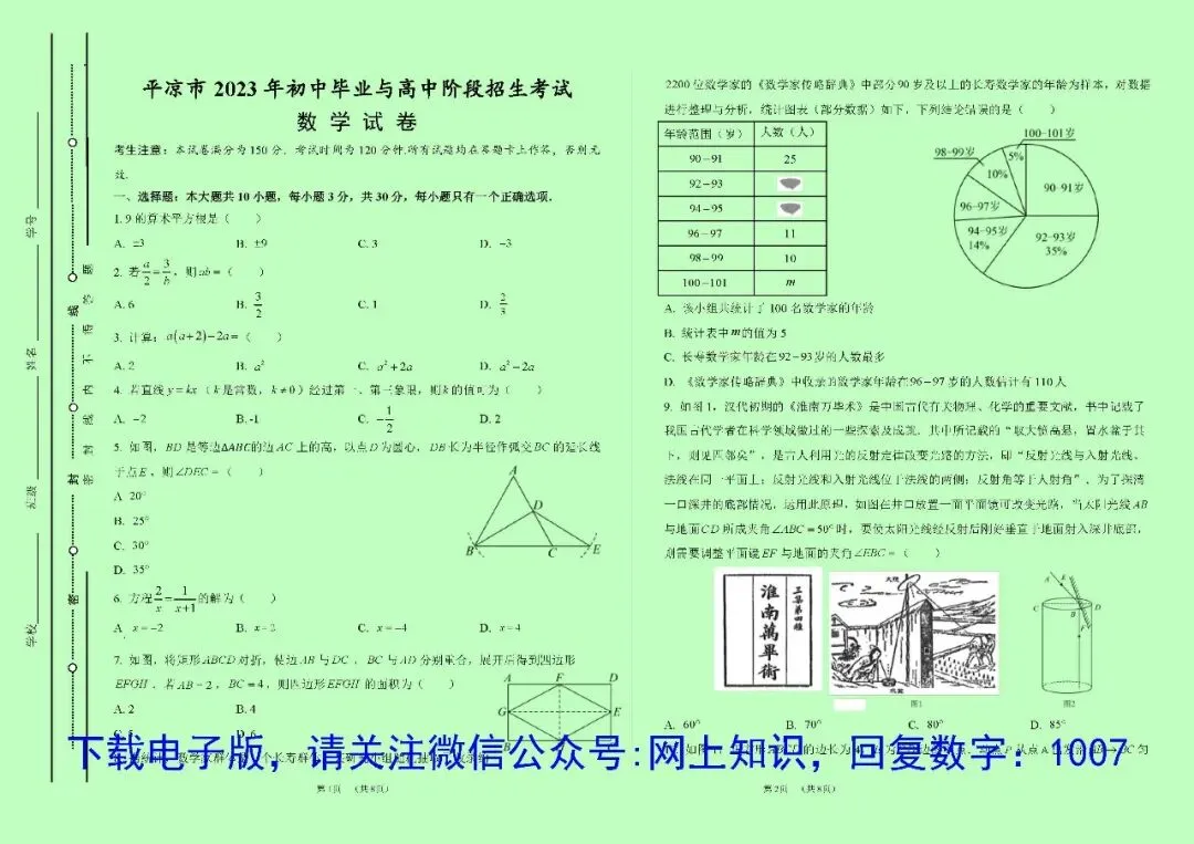 网上知识公众号为各位老师和学子整理了甘肃省平凉市近10年(2025-2016)中考数学真题,经过精心排版,制作了pdf和word两种格式试卷A3版文件,全部提供电子版,下载后可无限制打印,下载说明附后。电子版文档下载后都可查参考答案或解析,对复习和研究中考命题有很大的帮助。