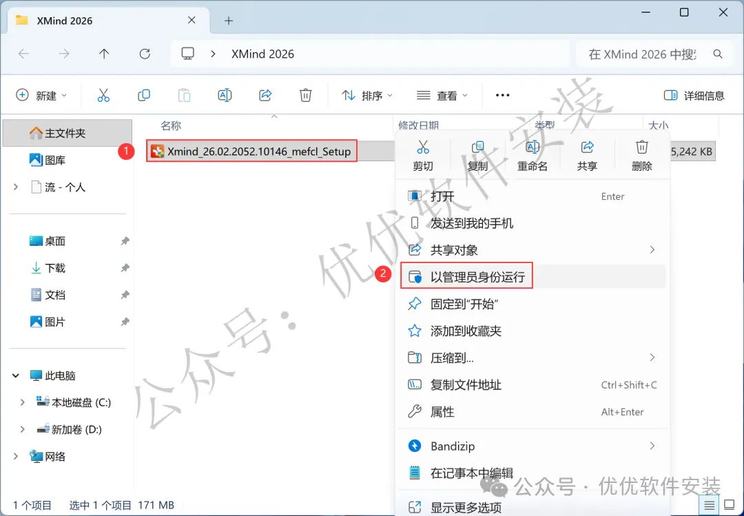 3、找到【Xmind_2026…】应用程序,右键选择【以管理员身份运行】它