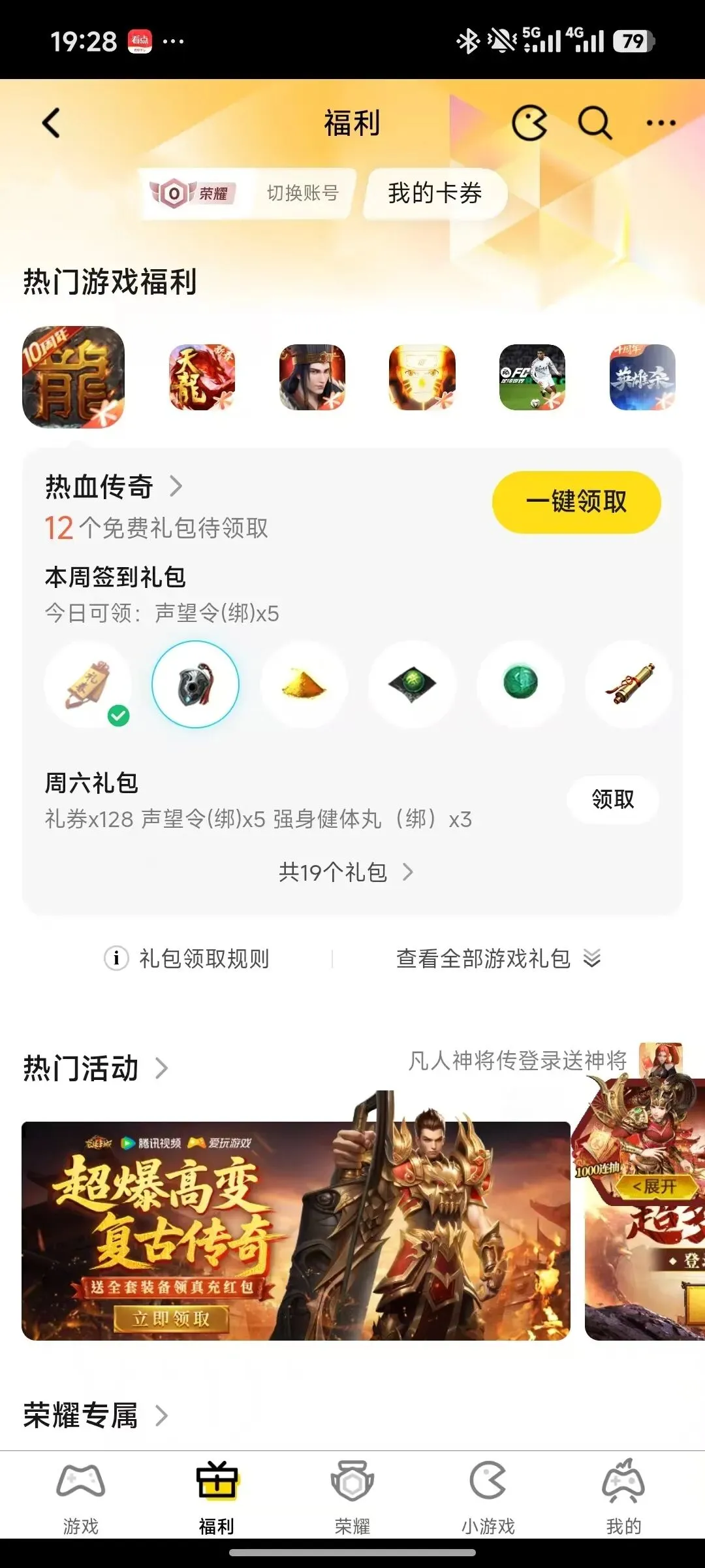 第六个:腾讯视频,进去之后点下面福利(也需要登录对应需要领礼包的游戏账号),就能看到,如果没有就搜索一下热血传奇手游。