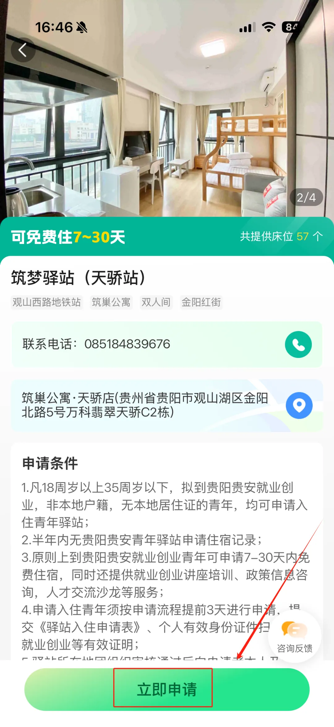 4、再次进入驿站界面选择意向驿站,确定房源后点击立即申请;