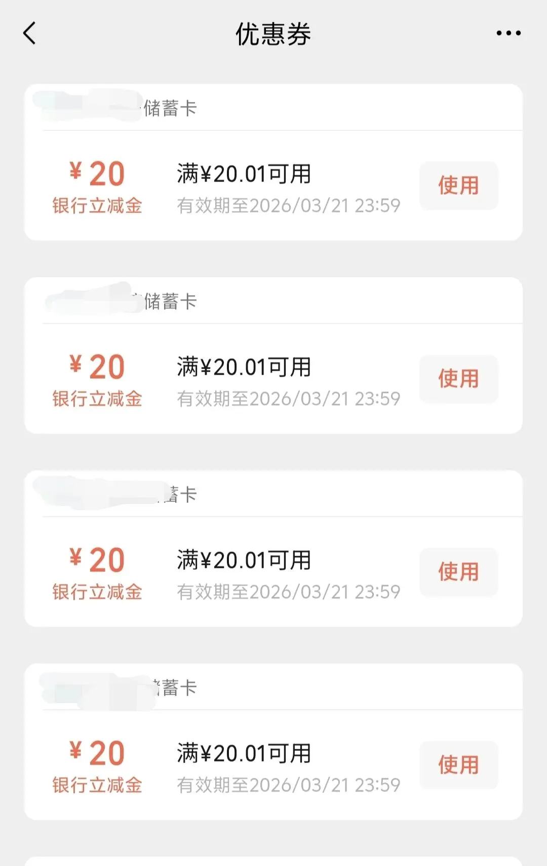 昨天晚上随手打开了当地一家银行APP,本来只是想看看3.8节有没有活动,没想到意外发现了4张优惠券,每张都是20元微信立减金,加起来整整80元。
