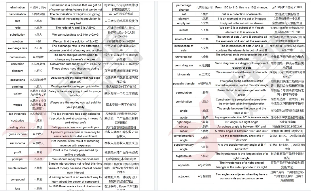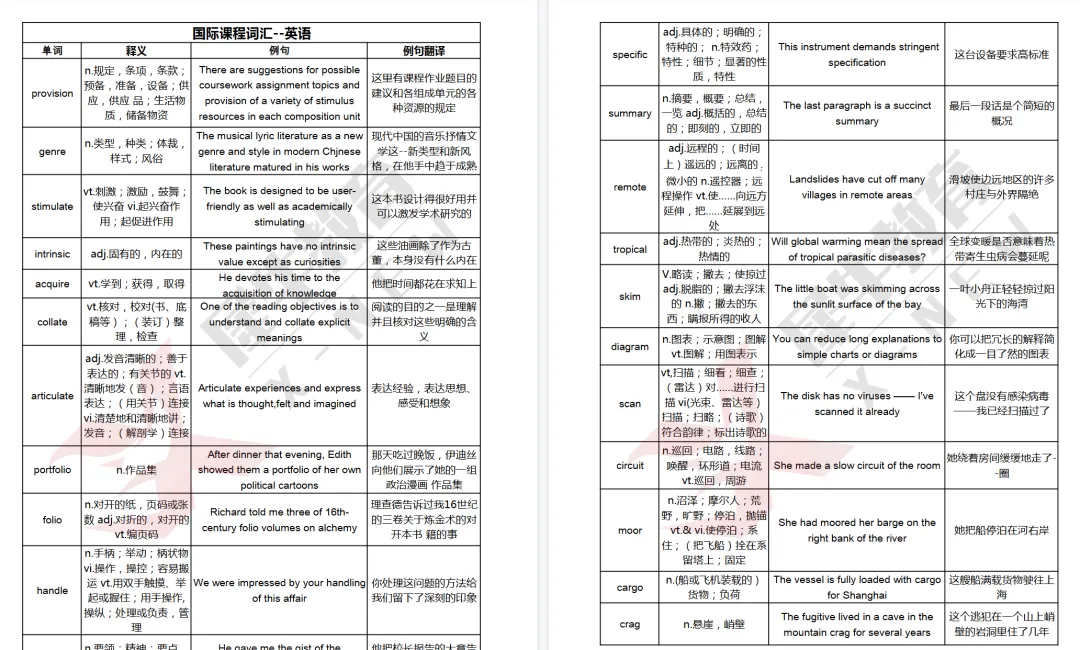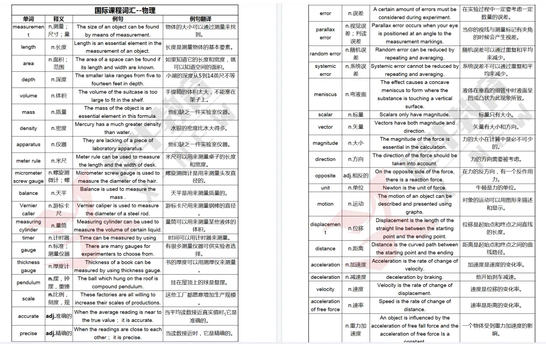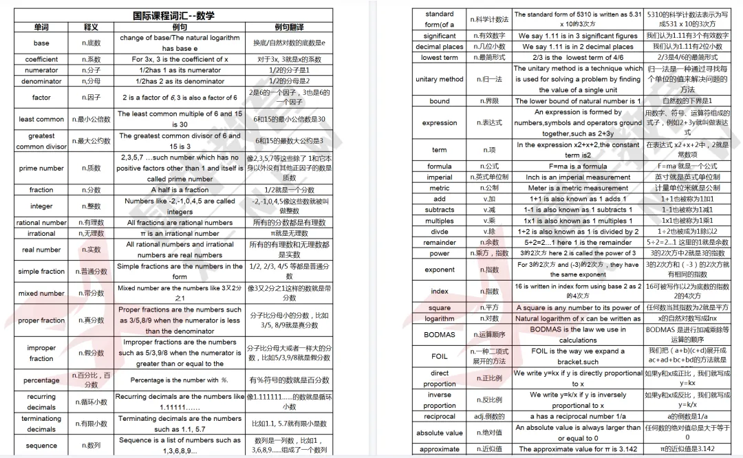 这套IGCSE词汇表覆盖IGCSE数学,IGCSE物理,IGCSE英语,IGCSE化学,IGCSE生物,IGCSE经济等多个热门科目,基本包含核心板块知识点所需词汇术语,每个词汇附带完整中文意思解释,英文释义,术语例句等,方便学生理解知识点。