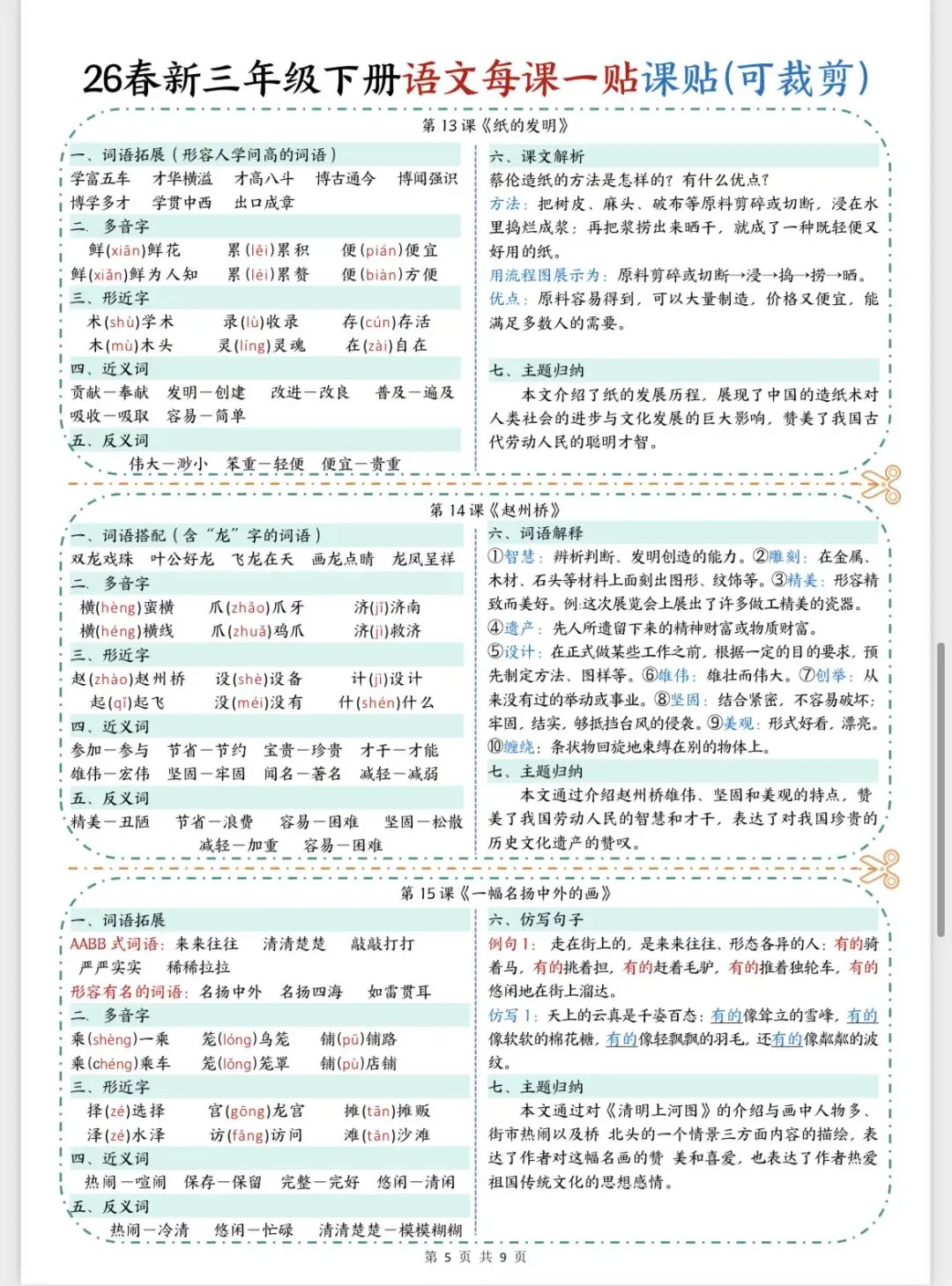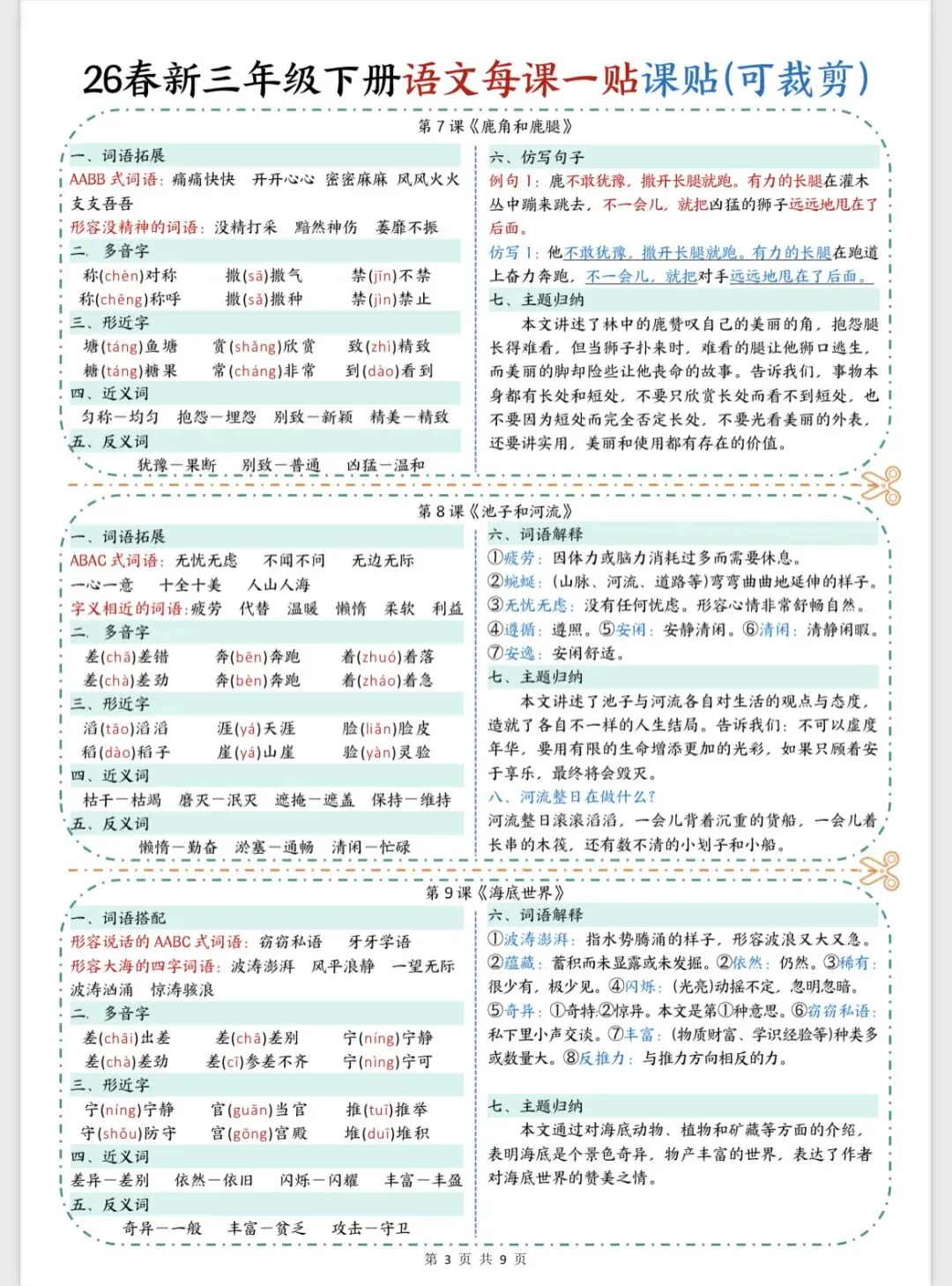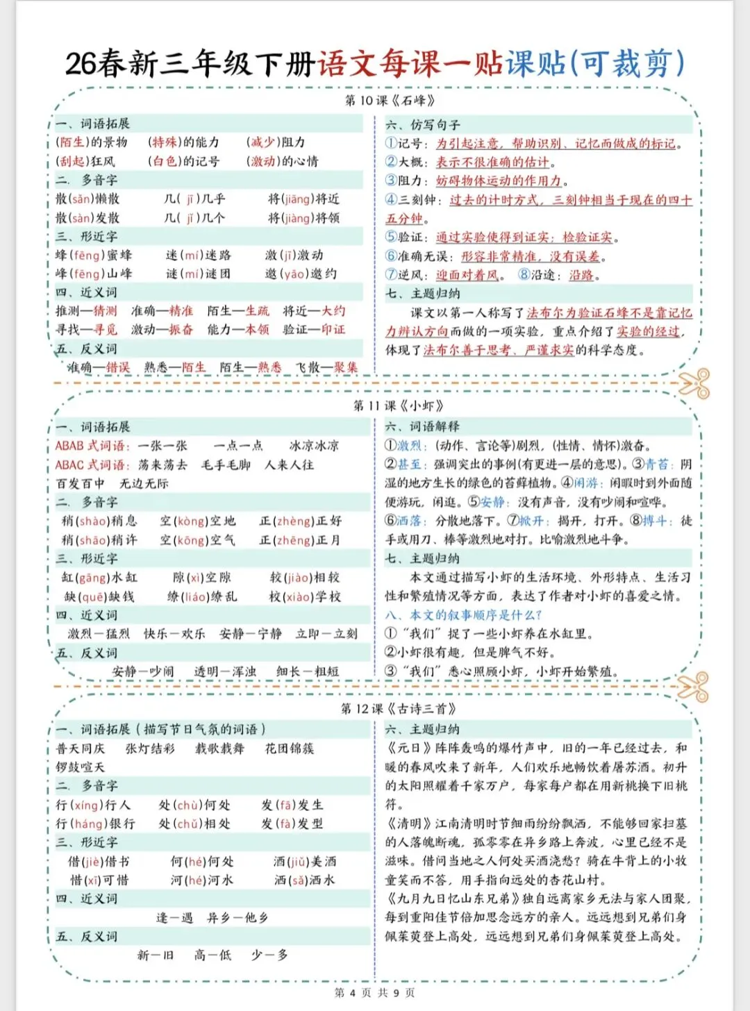 26春新版三年级下册语文每课一贴课课贴可裁剪 共9页 | 可打印