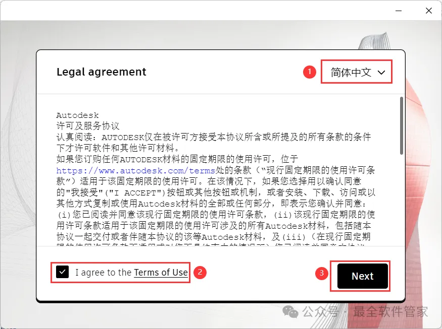 5、语言选择【简体中文】,勾选【我同意】,再点击【Next】