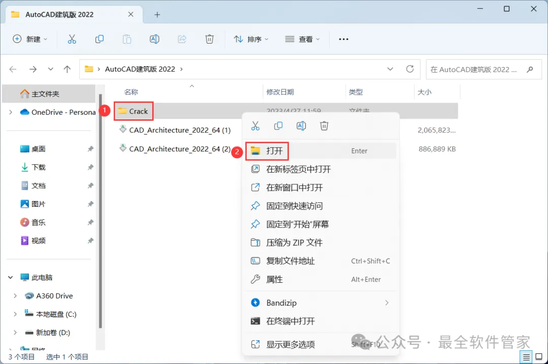 10、回到AutoCAD建筑版 2022文件夹,找到【Crack】文件夹,右键【打开】它