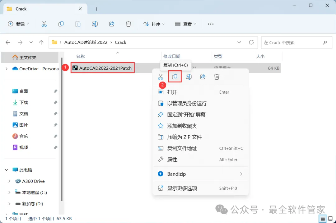 11、找到【AutoCAD2022-2021Patch】程序,再右键点击【复制按钮】