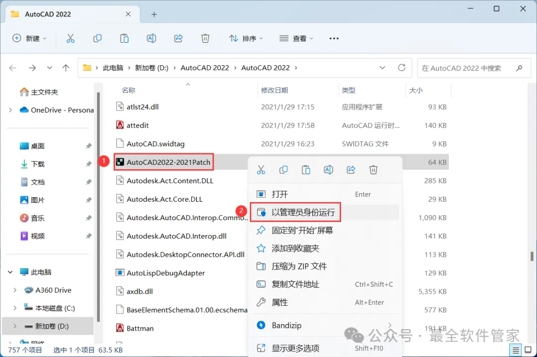 14、找到粘贴的【AutoCAD2022-2021Patch】程序,再右键选择【以管理员身份运行】它