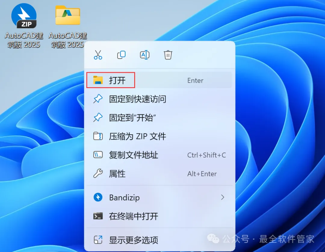 10、回到桌面,右键桌面上的【AutoCAD Architecture 2025软件图标】,点击【打开】