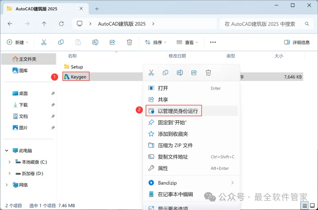 8、回到AutoCAD建筑版 2025文件夹,找到【Keygen】应用程序,右键选择【以管理员身份运行】它